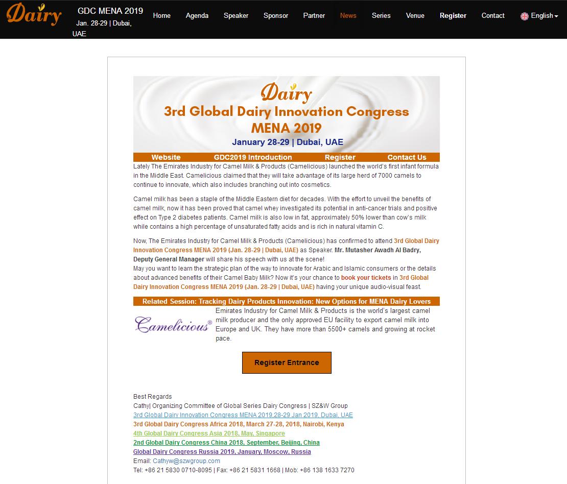 Global Dairy Innovation Congress MENA 2019, highlight Camel Infant Formula.