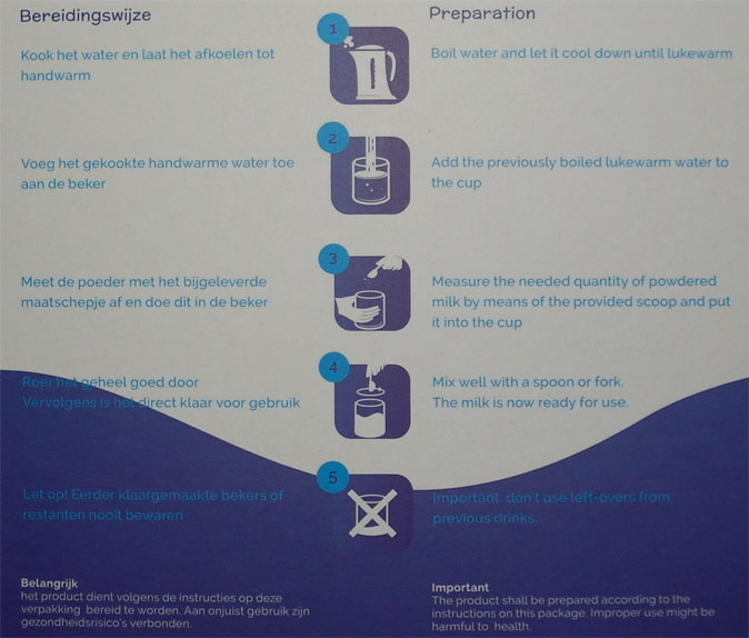 Magere melkpoeder, inuline, oligofructose, vitamines (ascorbinezuur, choline, niacine-amide, dl- alfatocoferylacetaat, calciumpantothenaat, retinylacetaat, thiaminemononitraat, riboflavine, pyridoxinehydrochloride, foliumzuur, fytomenadion, cholecalciferol, biotine, cobalamine), Mineralen (calciumcarbonaat, calciumcitraat, magnesiumsulfaat, ijzersulfaat, zinksulfaat, kopersulfaat, mangaansulfaat, kaliumjodide), vanilla-aroma, B.Bifidum.