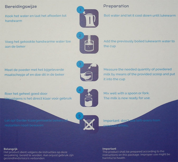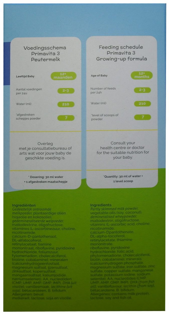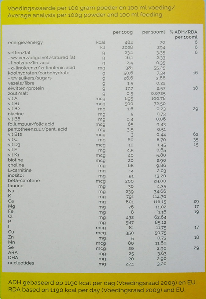Het product bevat ondermeer plantaardige oliën, oligosacchariden, essentiële vetzuren, vitamine C, bèta-caroteen, DHA, ARA, 5 nucleotiden en een Bifidobacteriecultuur.